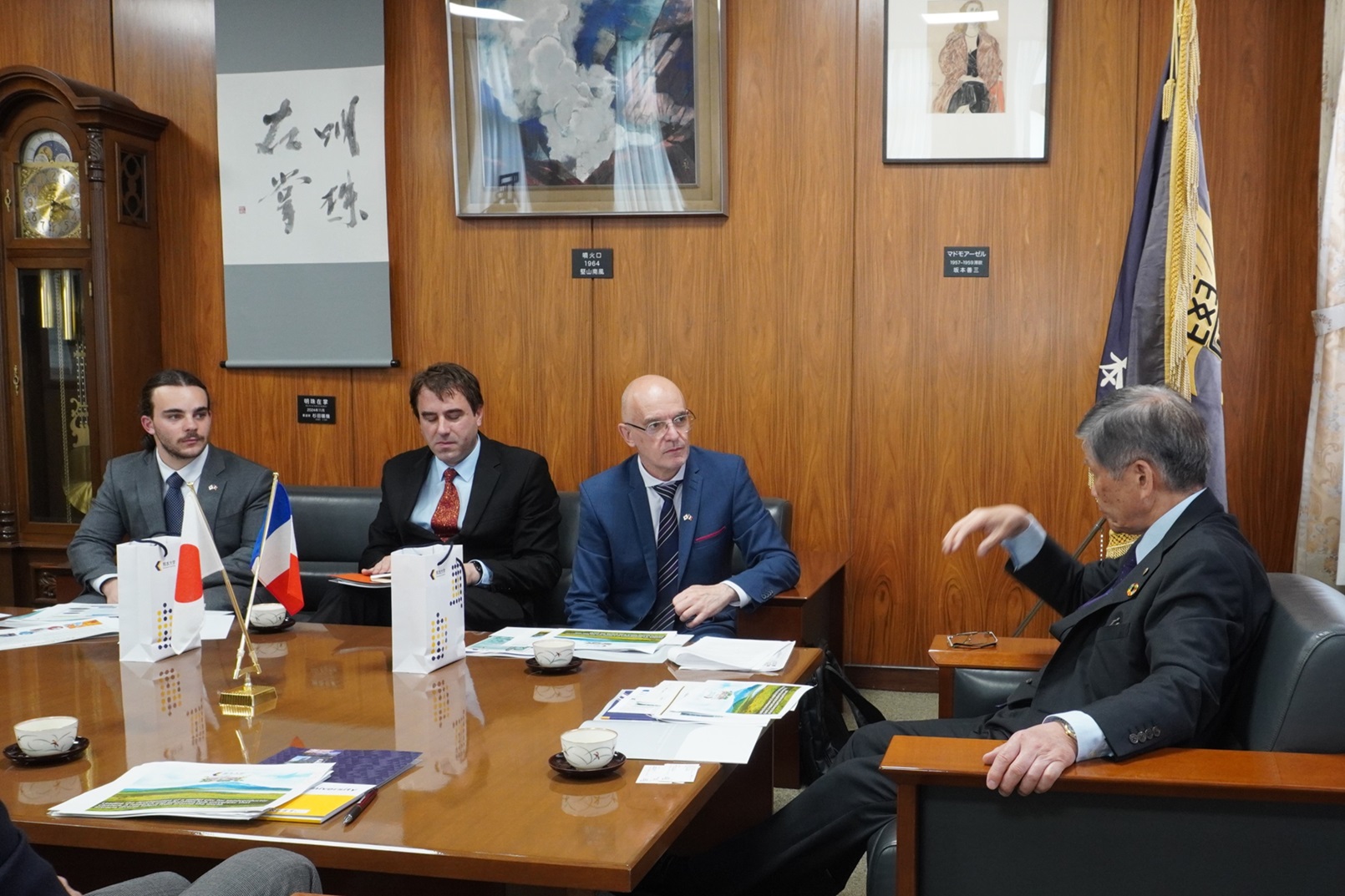 On April 21, 2025, a delegation from the Embassy of France in Tokyo paid a courtesy visit to President Hisao Ogawa of Kumamoto University. The delegation consisted of three representatives: Prof. Didier Marty-Dessus, Science and Technology Counsellor; Dr. Jean-Baptiste Bordes, Science and Technology Officer; and Mr. Aymeric Tardy, Project Manager of the Science and Technology Department. The purpose of the visit was to gain a deeper understanding of Kumamoto University’s initiatives in human resource development in the semiconductor field and to explore possibilities for future collaboration.Executive Vice President Jun Otani also attended the meeting and provided an overview of the university’s core initiatives and areas of focus. Prof. Marty-Dessus expressed his high regard for Kumamoto University’s leading role in developing semiconductor-related talent. He also conveyed interest in identifying potential complementary partnerships to strengthen collaboration in the semiconductor sector, so that both parties can leverage their strengths and collaboratively contribute to the advancement of the semiconductor industry.