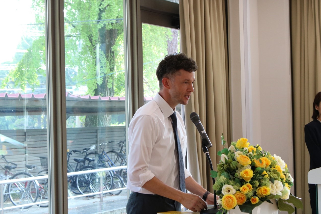 During his address, Lecturer Sims introduced the Japanese phrase “一期一会” (ichigo ichie), which translates to “one encounter, one opportunity.” He explained that this concept highlights the uniqueness of each meeting and moment, encouraging everyone to treasure their time at Kumamoto University as if it is a once-in-a-lifetime experience. In his speech, he also emphasized the importance of maintaining good health, building meaningful connections, and making the most of their time at the university to study hard—an investment for their future.