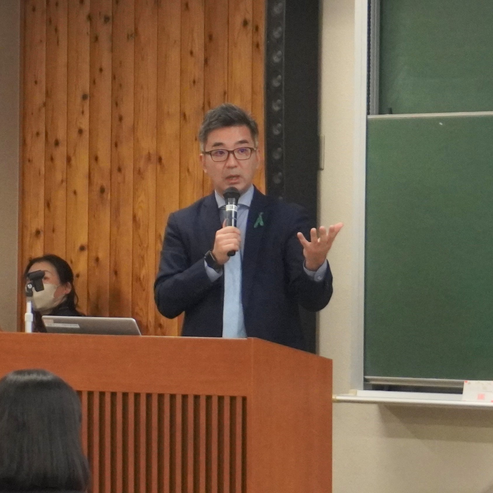 The speakers were Dr. Shigeyoshi Yamanaga (Director, Department of Transplant Surgery, Kumamoto Red Cross Hospital), Dr. Joyce Trompeta (Professor of Surgery, UCSF, and Fulbright Scholar), and Dr. Kiyotaka Uchino (Surgical Resident, Kumamoto Red Cross Hospital). They discussed the current status of organ transplantation in Japan and the U.S., and shared their experiences of study and research abroad.