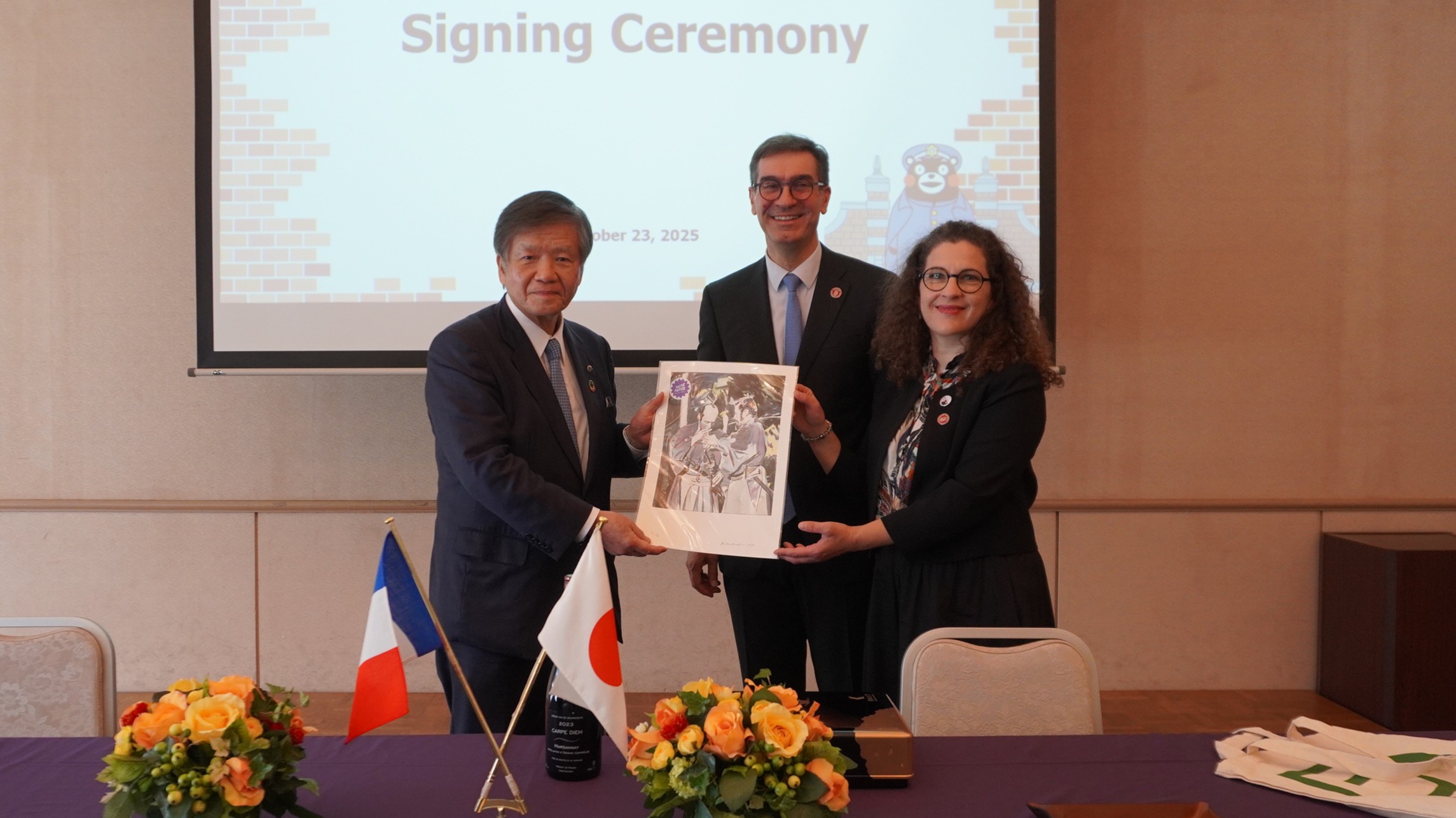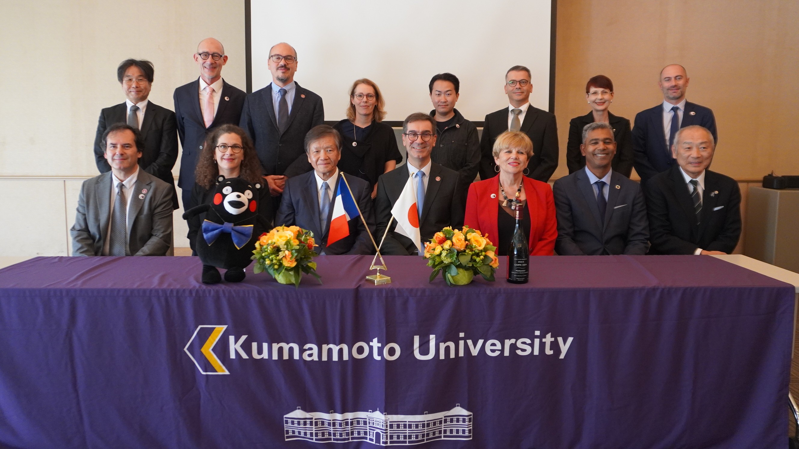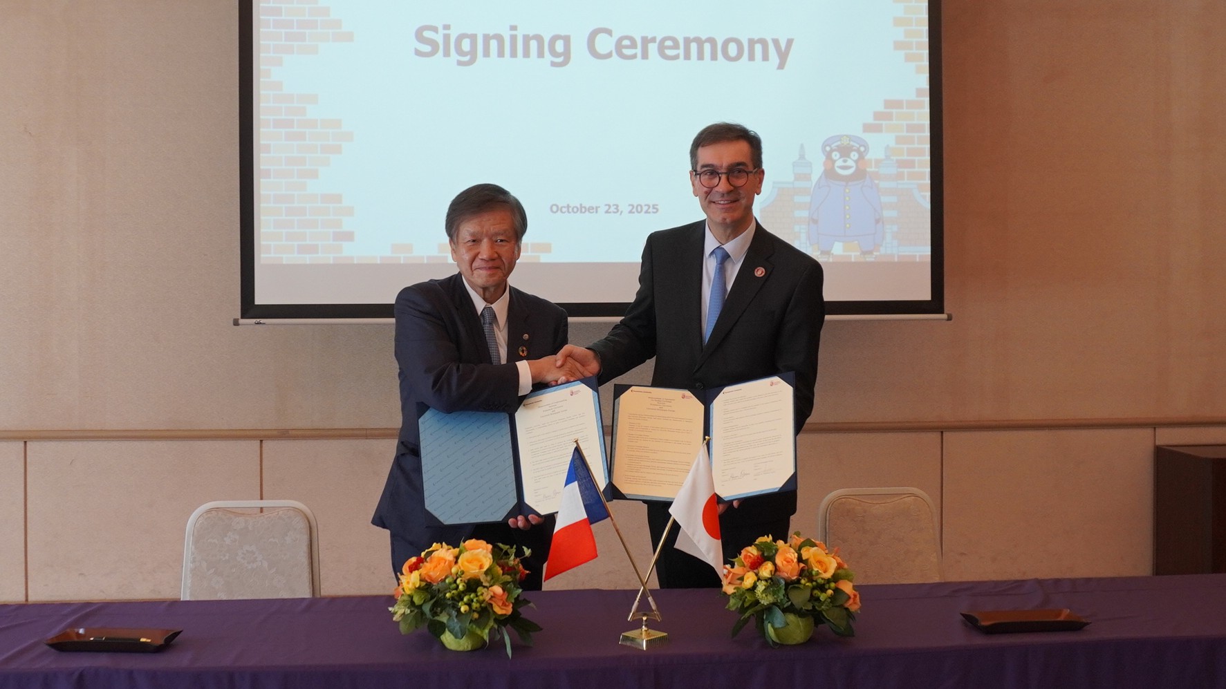 On October 23, a signing ceremony was held at Kusunoki Hall, Kurokami North Campus, to formalize the inter-university exchange agreement between Kumamoto University and Université Bourgogne Europe (France). The ceremony was attended by distinguished representatives from both institutions, including President Vincent Thomas and Vice President Grégory Wegmann alongside several other representatives from Université Bourgogne Europe. Also present were notable guests from Dijon Métropole, the home region of the university, including Deputy Mayor of Dijon and Councillor of Dijon Métropole Mr. Denis Hameau and Ms. Lydie Pfander-Meny, alongside several other representatives from the Dijon Métropole. From Kumamoto University, the ceremony was attended by President Hisao Ogawa, Executive Vice President Jun Otani, and three faculty members.Following the opening remarks from President Ogawa, President Thomas, and Deputy Mayor Hameau, Professor Michel Sagaz from the Faculty of Humanities and Social Sciences presented an overview of Kumamoto University, as well as the background of the partnership agreement, delivered in French.