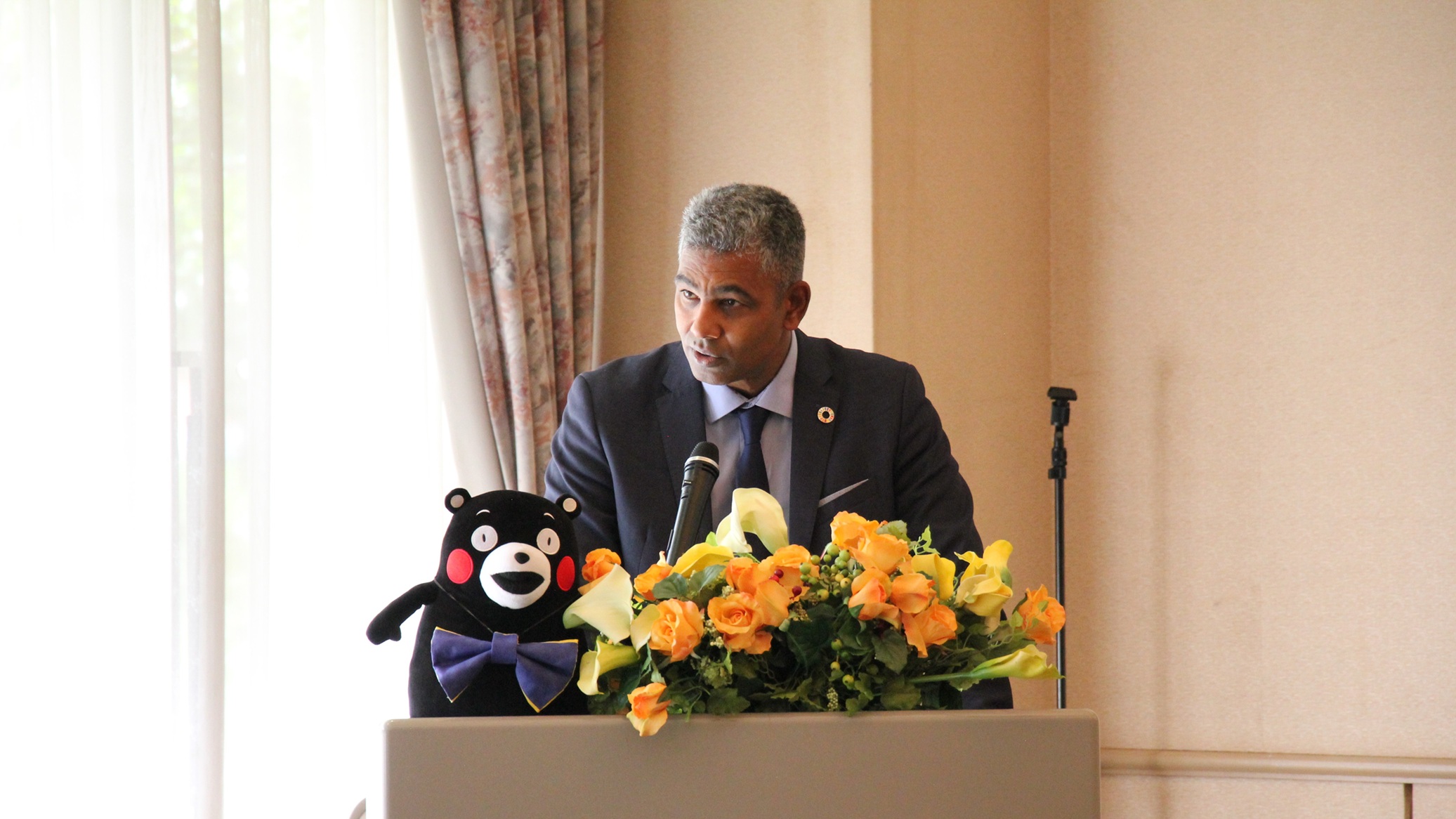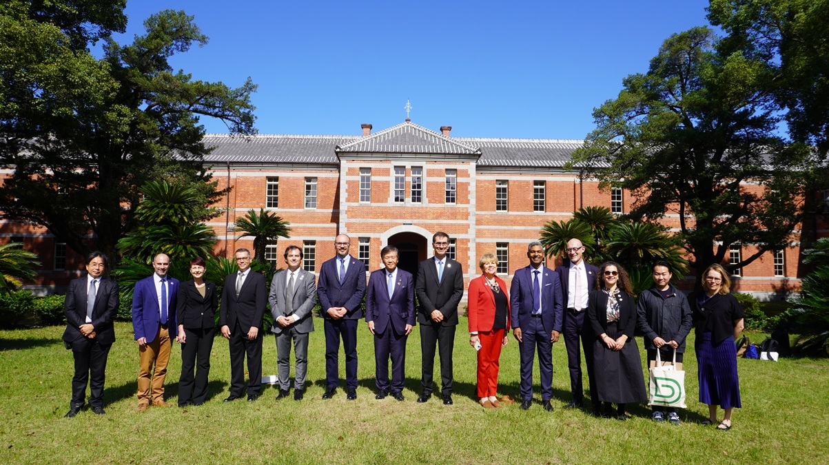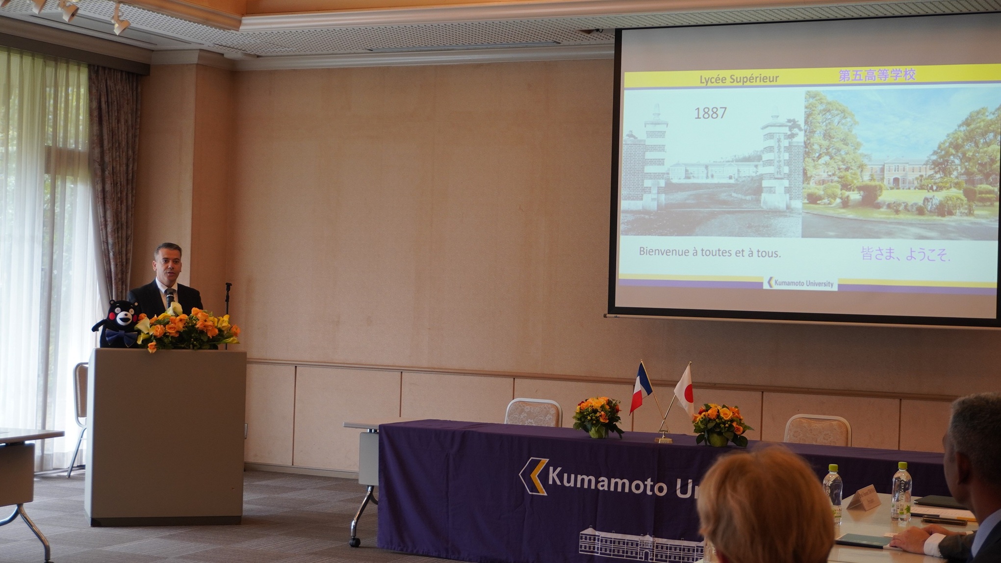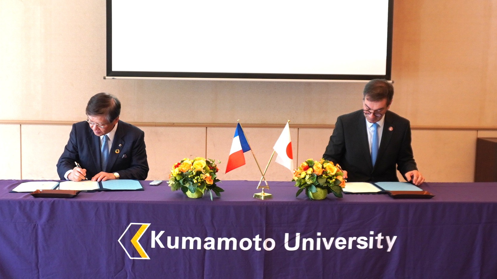 On October 23, a signing ceremony was held at Kusunoki Hall, Kurokami North Campus, to formalize the inter-university exchange agreement between Kumamoto University and Université Bourgogne Europe (France). The ceremony was attended by distinguished representatives from both institutions, including President Vincent Thomas and Vice President Grégory Wegmann alongside several other representatives from Université Bourgogne Europe. Also present were notable guests from Dijon Métropole, the home region of the university, including Deputy Mayor of Dijon and Councillor of Dijon Métropole Mr. Denis Hameau and Ms. Lydie Pfander-Meny, alongside several other representatives from the Dijon Métropole. From Kumamoto University, the ceremony was attended by President Hisao Ogawa, Executive Vice President Jun Otani, and three faculty members.Following the opening remarks from President Ogawa, President Thomas, and Deputy Mayor Hameau, Professor Michel Sagaz from the Faculty of Humanities and Social Sciences presented an overview of Kumamoto University, as well as the background of the partnership agreement, delivered in French.