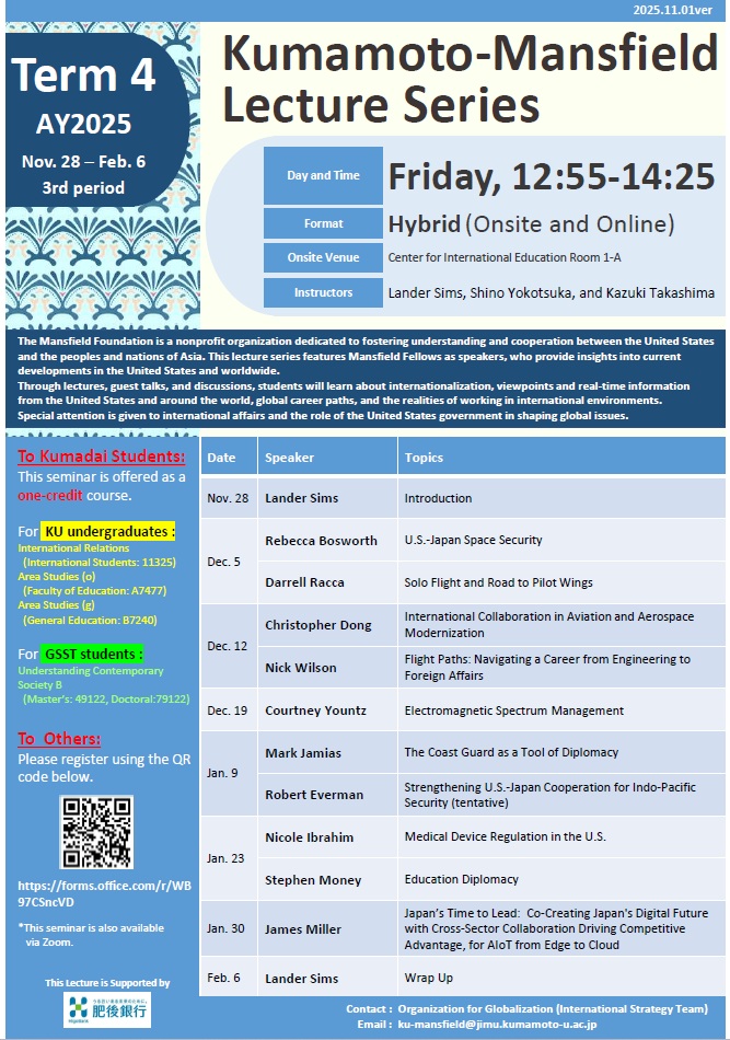 Kumamoto University will hold the seminar series cooperated with The Maureen and Mike Mansfield Foundation (The Mansfield Foundation) as follows. The U.S. Government Officials who are staying in Japan as Mansfield Fellows and other distinguished speakers will give talks about their knowledge and experiences.