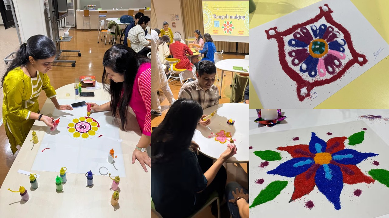 The main highlight of the event was the Rangoli making session, where participants got hands-on experience of designing rangoli with bright powdered colors. This interactive session allowed everyone to showcase their creativity, resulting in creation of beautiful designs and patterns.