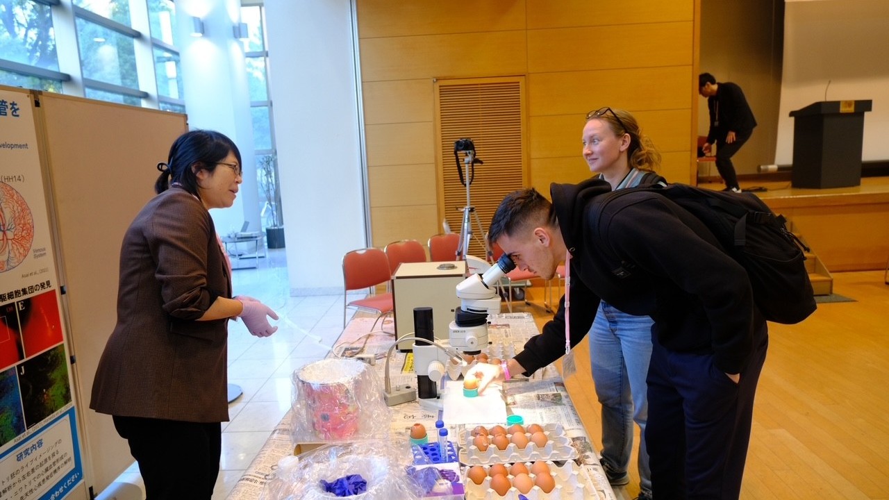 The poster session itself included presentations where researchers explained their work directly in front of their posters. In addition, selected presenters delivered one-minute oral presentations to highlight their research. A total of 28 posters were presented, covering a wide range of topics from life sciences to social sciences, spanning basic laboratory research to applied technologies contributed by corporations. The variety ensured a rich interdisciplinary exchange. A special booth also allowed participants to observe the chick embryo’s heart and surrounding blood vessels under a microscope, bringing science closer to everyday experience.