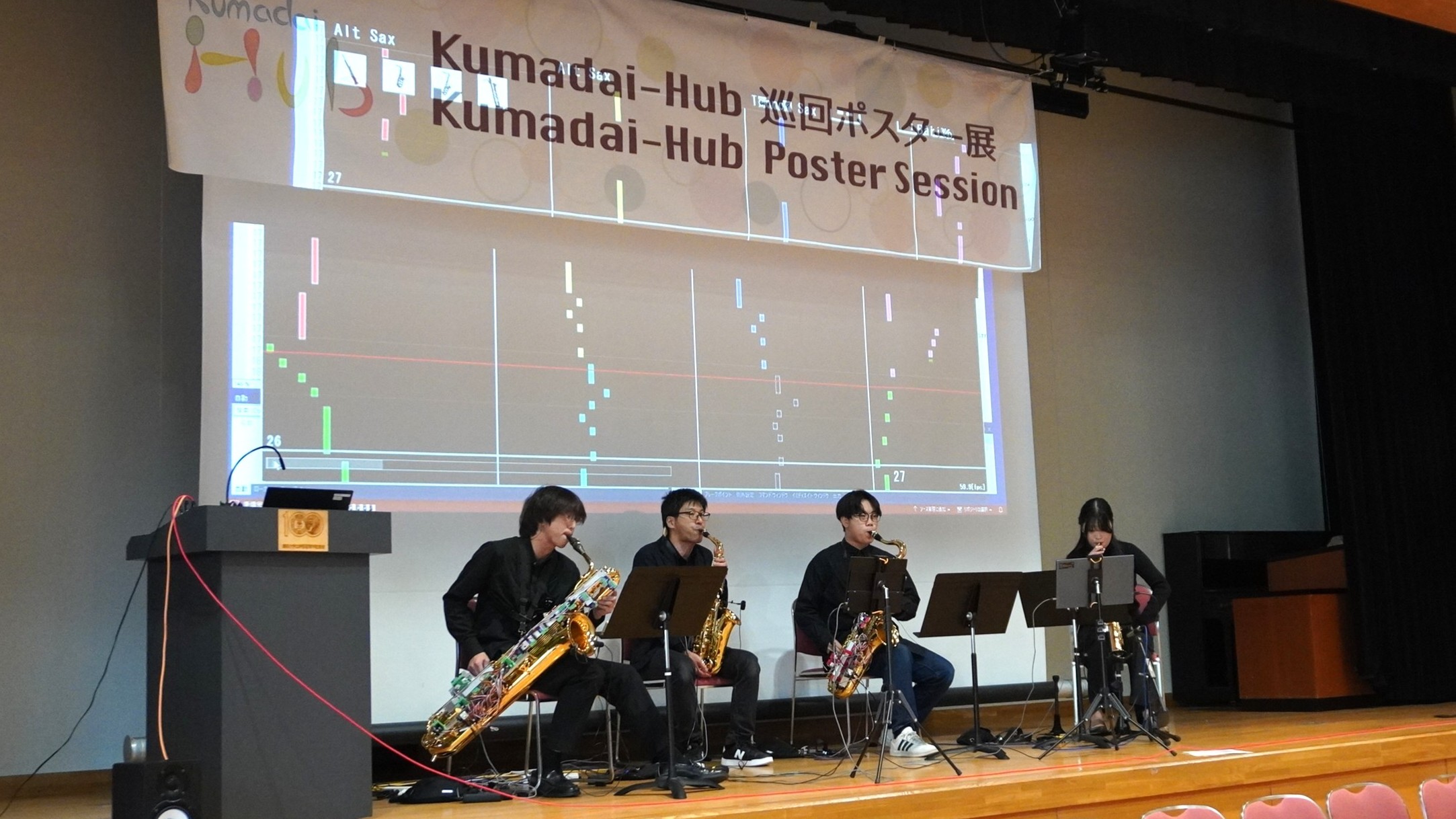 On November 26, the 5th Kumadai-Hub Poster Session took place at the 100th Anniversary Hall. The event attracted more than 130 participants, including faculty members, staff, and students from Kumamoto University, as well as representatives from industry, the Kumamoto government, and local senior high schools. Notably, this year’s session welcomed presenters joining from Airlangga University in Indonesia—one of Kumamoto University’s partner universities—who shared their research through posters, adding an international dimension to the event. Participants from various countries contributed to a diverse and vibrant atmosphere, fostering meaningful exchange.The session opened with a special live performance featuring instruments equipped with semi-automatic robotic technology, presented in collaboration with members of the Kumamoto University Brass Band. This performance not only showcased cutting-edge musical robotics but also created a relaxed and welcoming environment for the subsequent discussions and networking.