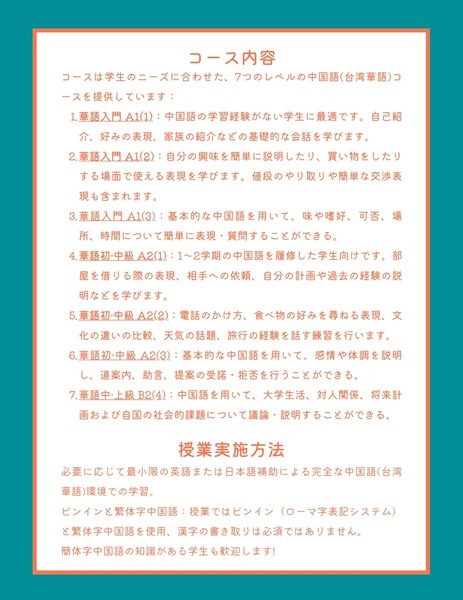 This program is especially recommended for students who wish to prepare for study abroad or develop an interest in international exchange. At the same time, faculty, staff, and members of the local community are also welcome to participate.