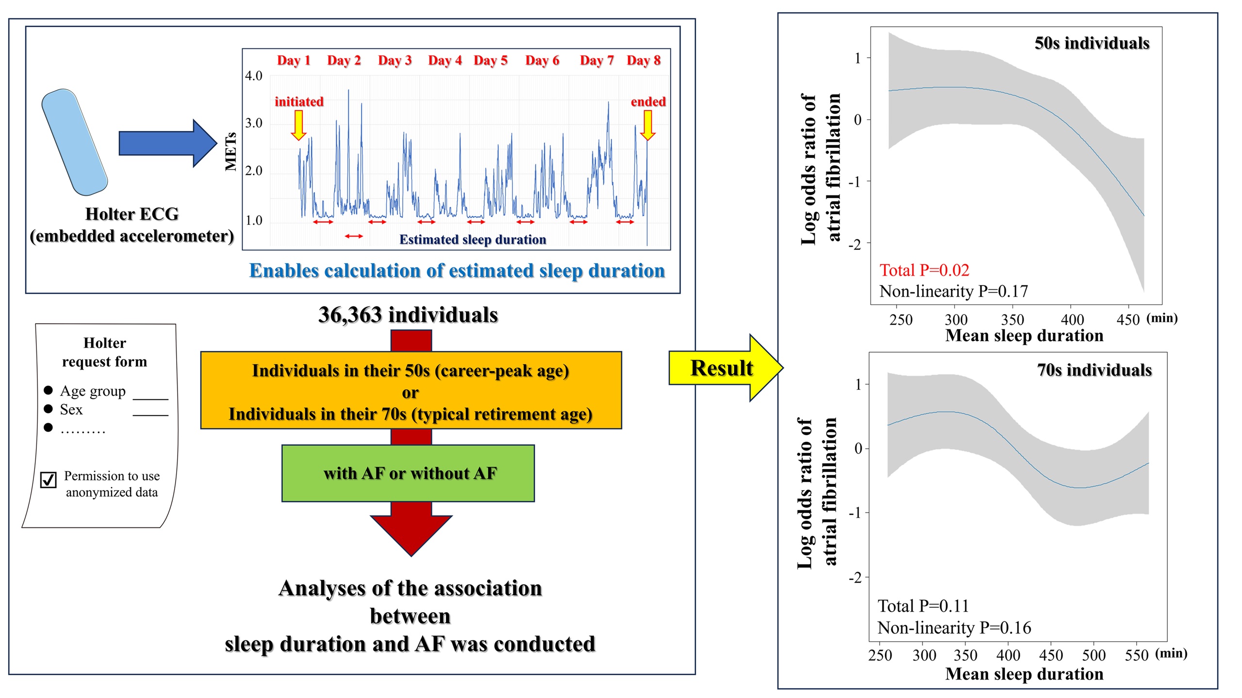 Sleep duration was objectively estimated using a one-week Holter electrocardiogram (ECG) equipped with an embedded accelerometer, enabling continuous monitoring during daily life. The analysis included 36,363 individuals in their 50s (peak working age) and 70s (typical retirement age), with and without atrial fibrillation (AF). Logistic regression and restricted cubic spline analyses demonstrated that shorter sleep duration was significantly associated with higher AF risk among individuals in their 50s, whereas no significant association was observed in individuals in their 70s.