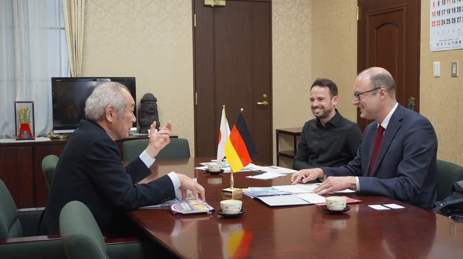 On February 18, 2026, Kumamoto University welcomed a delegation from the University of Greifswald, Germany, consisting of Professor Daniel Schiller, Vice Rector for Research and Transfer and Professor of Economic and Social Geography, and Dr. Max Roessler, a postdoctoral researcher.