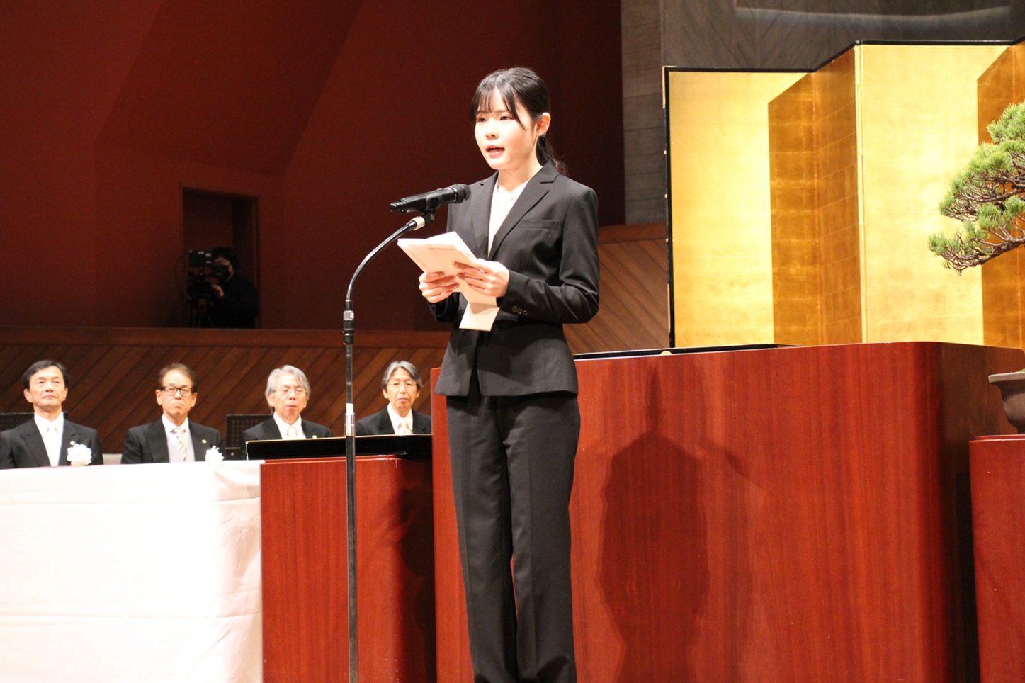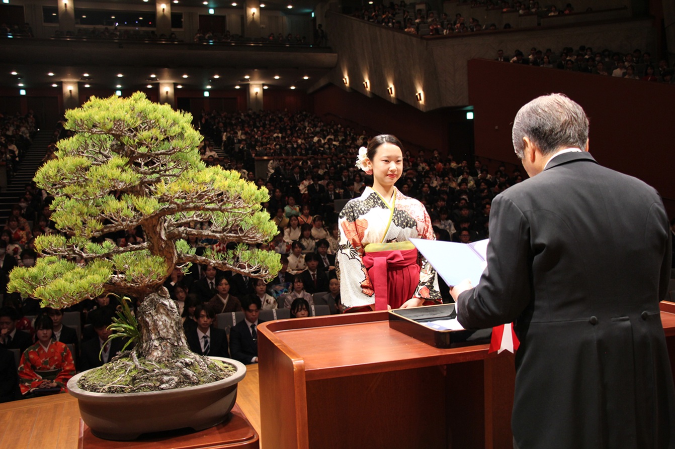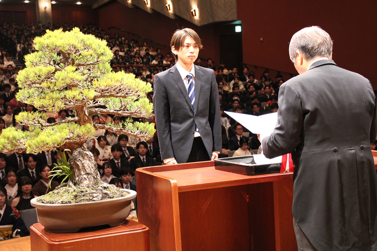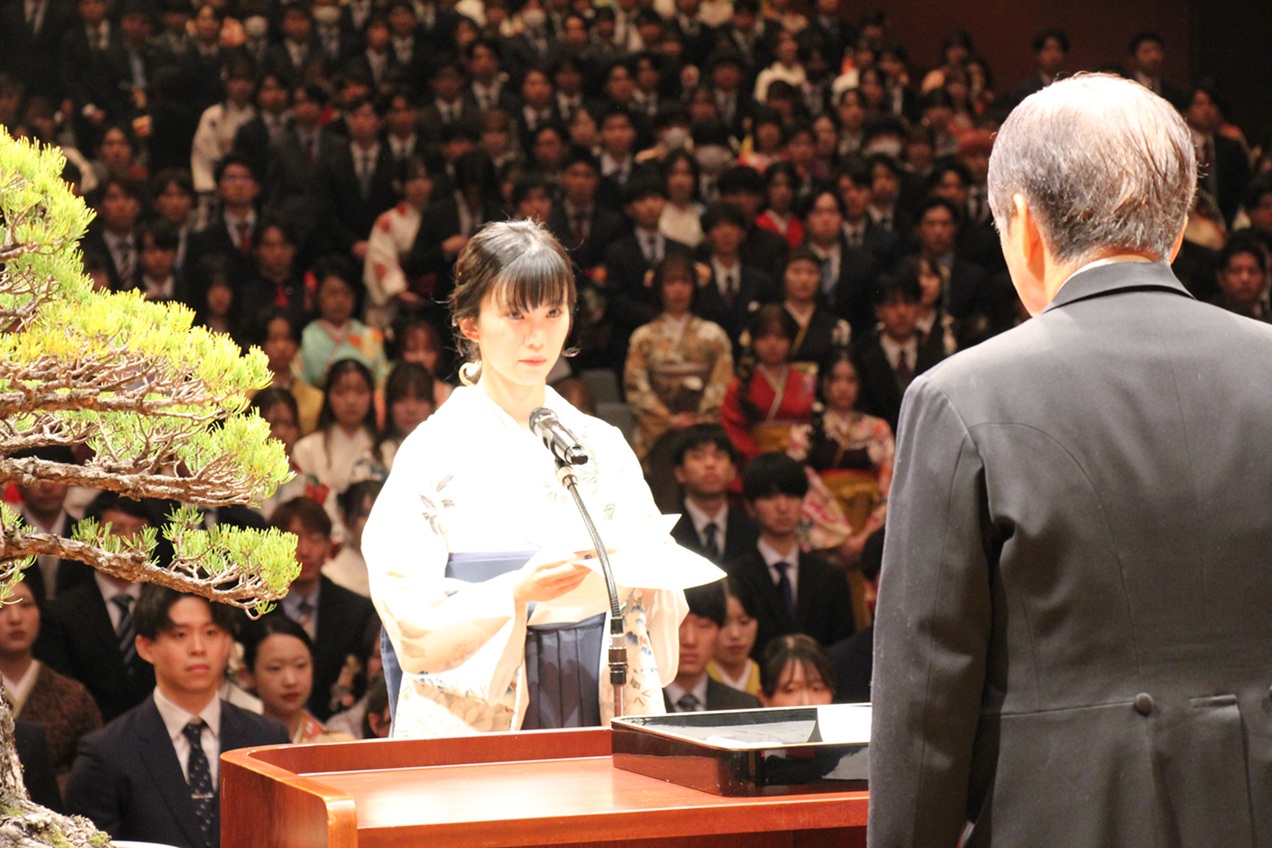 Following an address by President Hisao Ogawa, Ayano Imamura of the Faculty of Engineering delivered a farewell message on behalf of the current students, saying, “We hereby pledge to honor the legacy of our graduates and their commitment to excellence, carrying their spirit forward into the future generations.” On behalf of the graduating students, Minori Inoue of the Faculty of Law delivered the valedictory address, stating, “In a modern society, where many challenges lie ahead, we may face moments of uncertainty or hardship. Even so, we are determined to persevere through adversity and continue striving every day, cherishing the values instilled in us at Kumamoto University.”