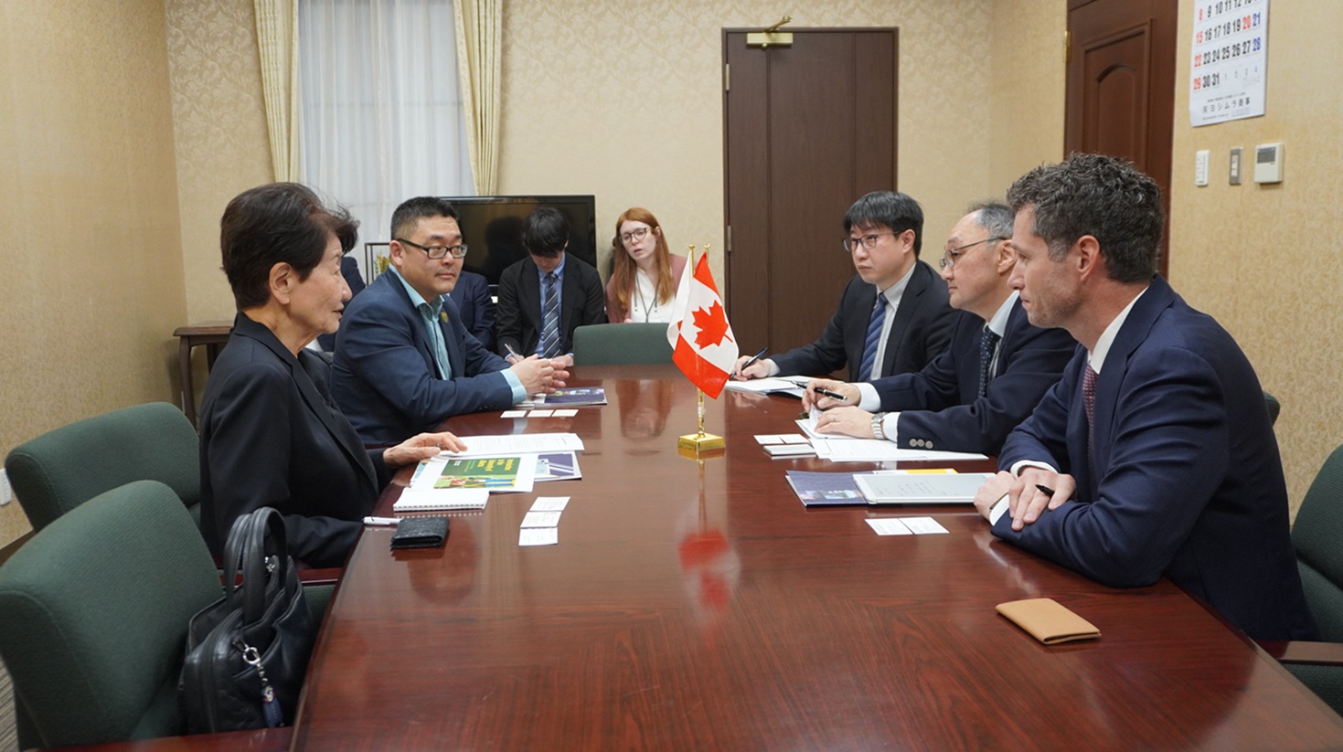 On March 27, 2026, Dr. Michael Chae, Director of Enterprise Partnerships, and Ms. Akiko Kosuda, Japan Principal for Business Development, from the University of Alberta, Canada, visited Kumamoto University. They met with Special Assistant to the President Lander Sims, Professor Ikuro Mizumoto of the Faculty of Advanced Science and Technology, and Professor Yukio Sato of the Research and Education Institute for Semiconductors and Informatics (REISI).
