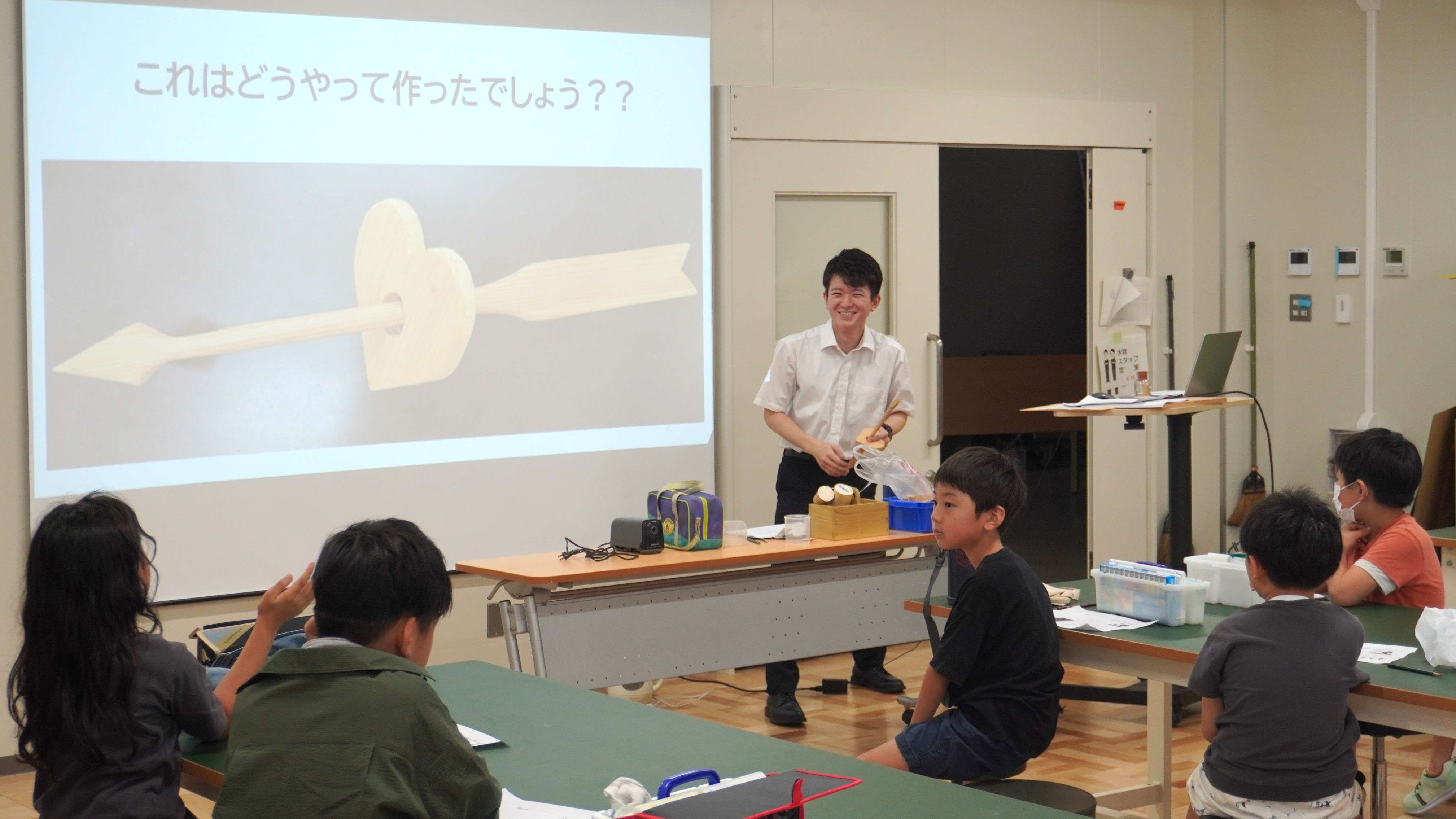 From 9:00 to 11:00 AM, 11 elementary students took part in a woodcraft session led by 4th-year student Mr. Maeda. The workshop focused on teaching the children how trees combat climate change through photosynthesis and how wood contributes to carbon storage. To spark their interest, students created wooden "Cupid arrows," demonstrating wood's unique shape-memory properties. This fun activity highlighted wood's lightness, strength, sustainability, and environmental benefits, igniting curiosity and enthusiasm for learning.