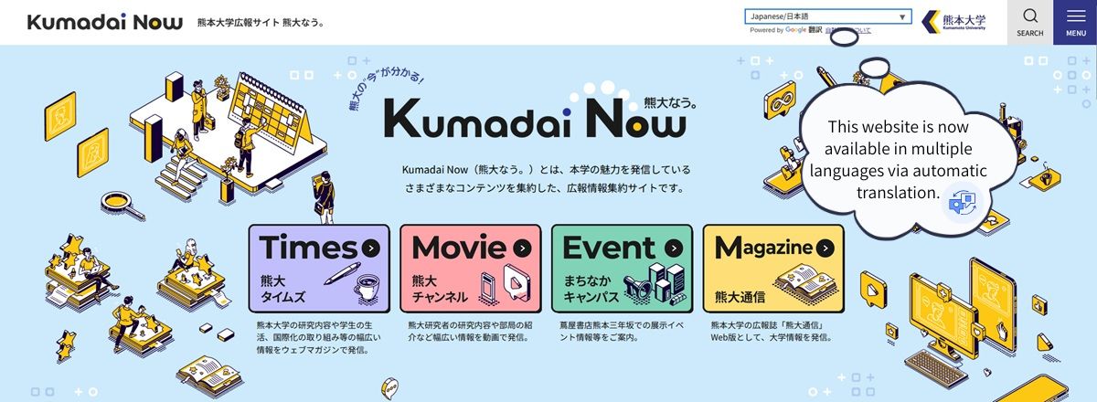 To better serve international audiences, Kumadai Now has introduced an automatic translation feature. Visitors can now view content in multiple languages by selecting their preferred language from the menu at the top right of the page. This update aims to make information about Kumamoto University more accessible to readers around the world.